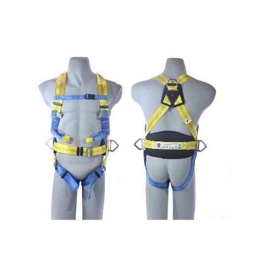 Arnés anticaídas con tomas anticaídas dorsal y frontal y tomas de sujeción en la cintura con protector lumbar.